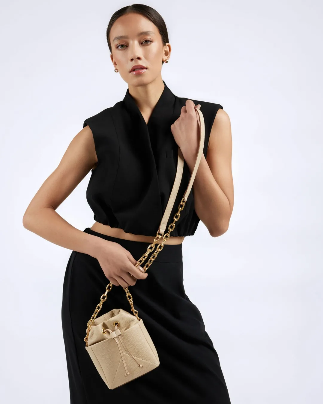 De GINA is een mini crossbody bucket bag. Het ontwerp lijkt op een kleine versie van een traditionele bucket bag. Hoewel dit een miniformaat betreft, biedt ze nog steeds voldoende ruimte om persoonlijke benodigdheden zoals een portemonnee, telefoon en sleutels in op te bergen.