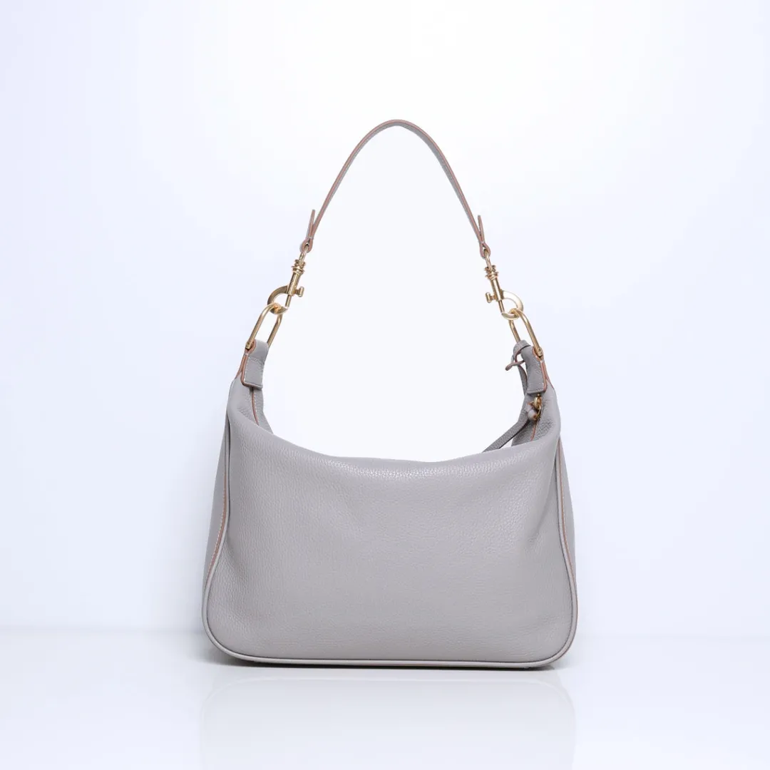 De tas is aan de zijkanten afgewerkt met brede stroken leer, verstevigd aan de onderkant en gaat geheel dicht door een ritssluiting. Beschikt over meerdere binnenvakjes en is gevoerd met suedine (viscose) materiaal. De tas heeft een korte leren schouderband en een lange leren crossbody band.