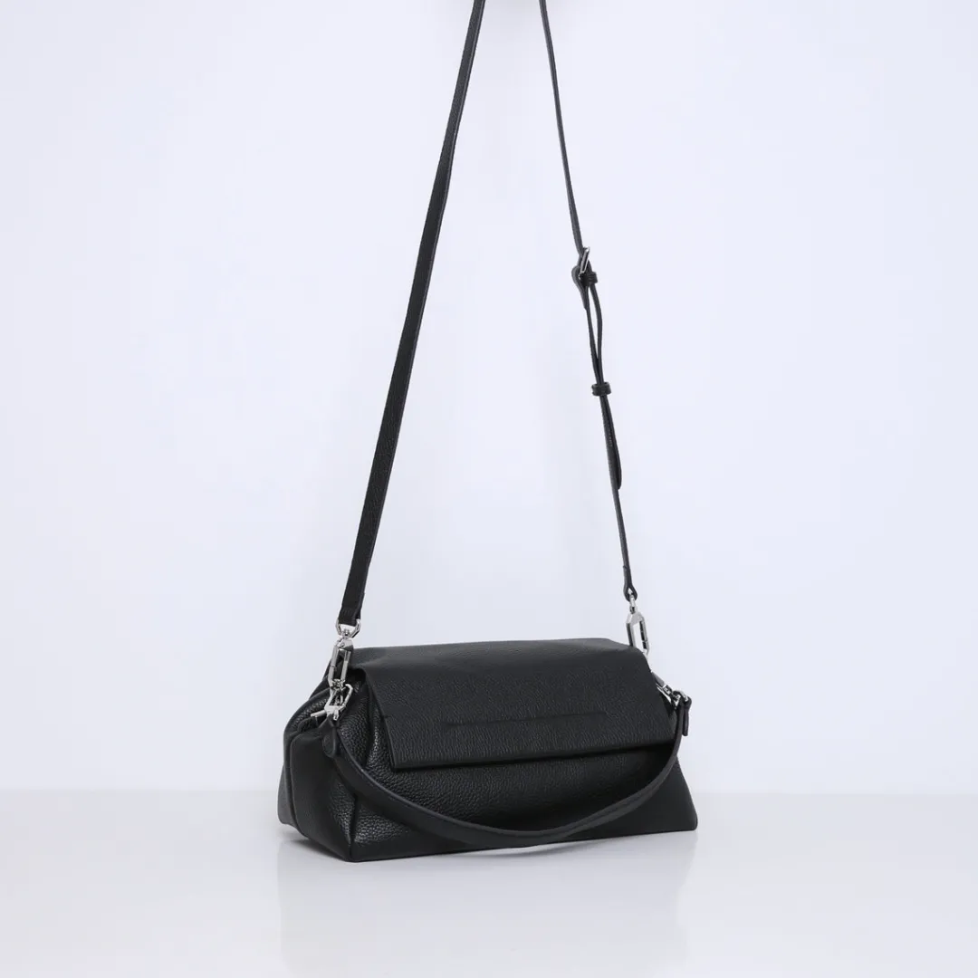 De tas komt met twee afneembare hengsels; een korte schouderband en een lange crossbody band die verstelbaar is in lengte. De tas is gemaakt van zacht en soepel rundleer gevoerd met suedine (viscose) materiaal.