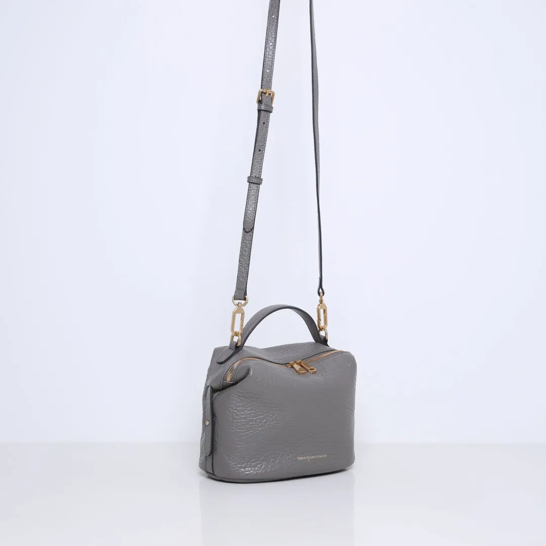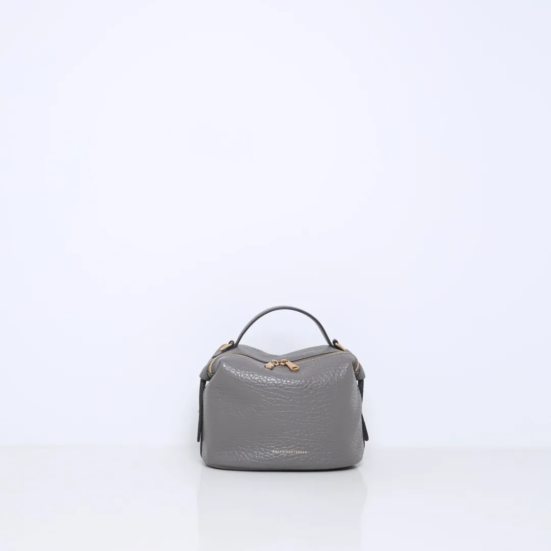 De tas is gemaakt van stevig rundleer met een reliëfpatroon van olifantenhuid. Beschikt over meerdere binnenvakjes en is gevoerd met suedine (viscose) materiaal. Met de afneembare, verstelbare leren schouderband kun je deze handtas op meerdere manieren dragen.