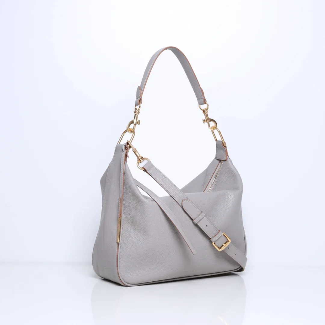 De tas is aan de zijkanten afgewerkt met brede stroken leer, verstevigd aan de onderkant en gaat geheel dicht door een ritssluiting. Beschikt over meerdere binnenvakjes en is gevoerd met suedine (viscose) materiaal. De tas heeft een korte leren schouderband en een lange leren crossbody band.