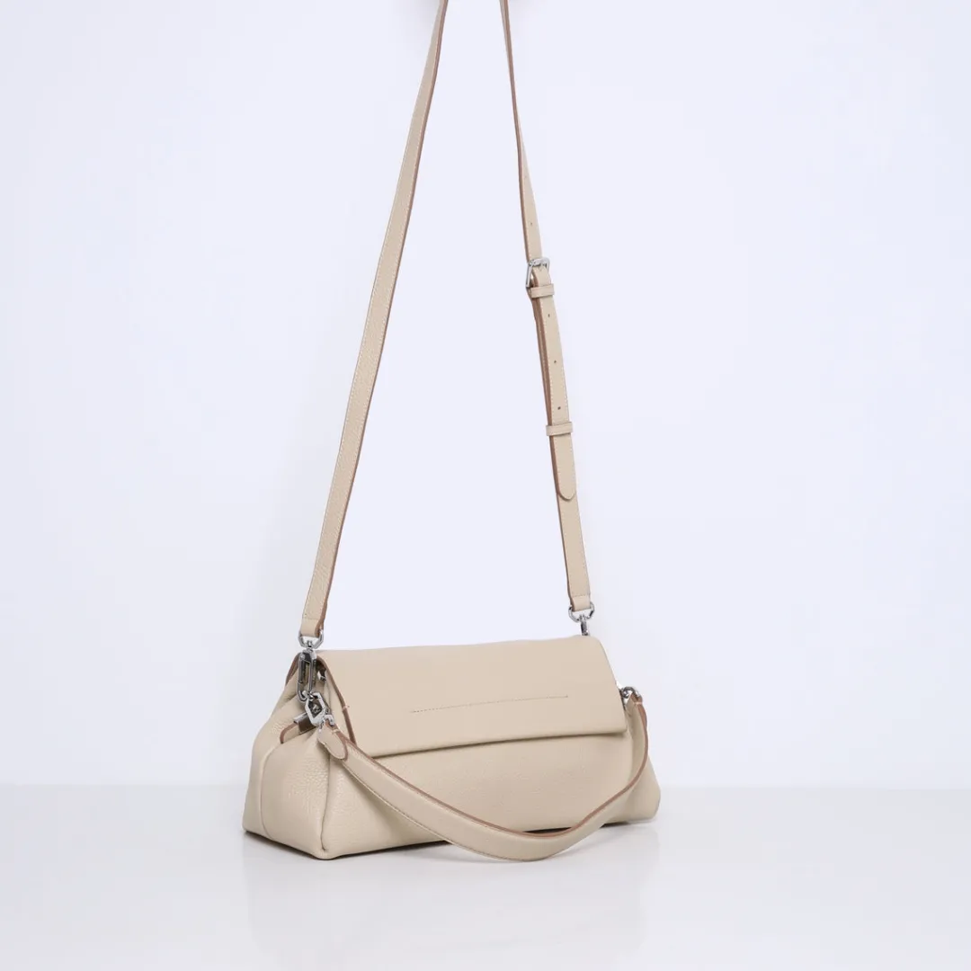 De tas komt met twee afneembare hengsels; een korte schouderband en een lange crossbody band die verstelbaar is in lengte. De tas is gemaakt van zacht en soepel rundleer gevoerd met suedine (viscose) materiaal.