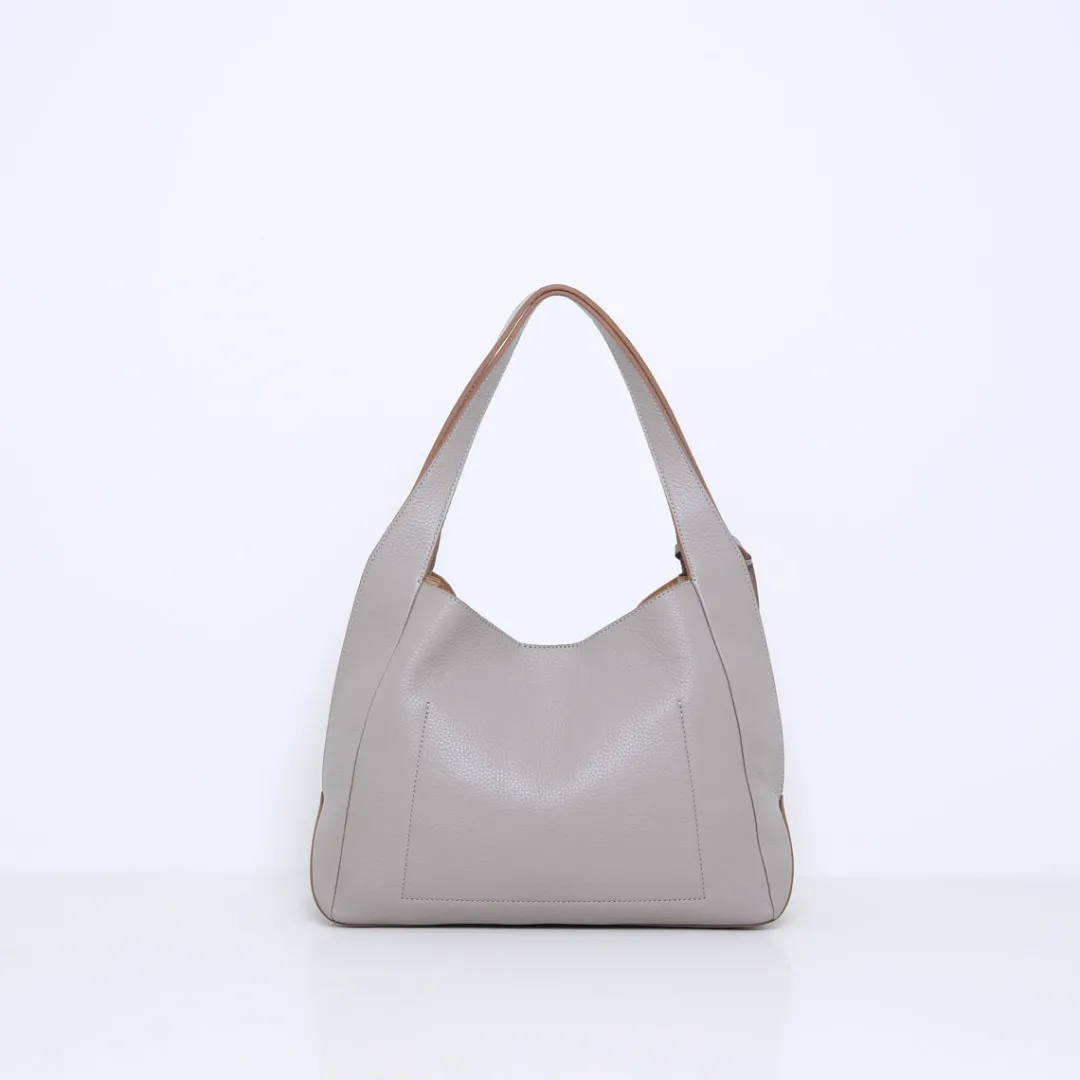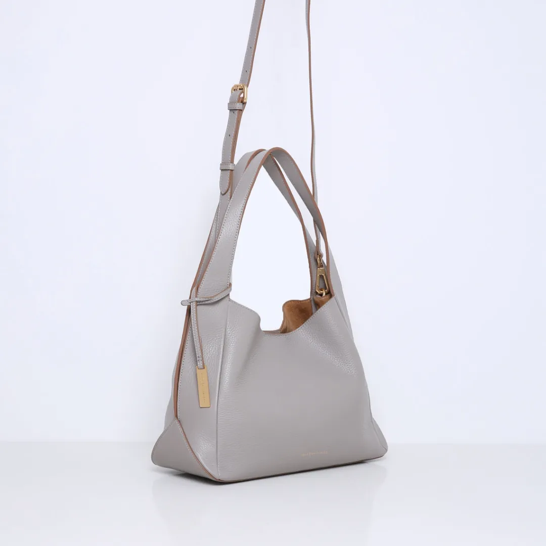 De handtas heeft twee stevige leren hengsels die naadloos overgaan aan de zijkanten van de tas en daar eindigen in een stijlvolle split. Deze splits voegen niet alleen een verfijnd detail toe, maar zorgen ook voor extra flexibiliteit en comfort bij het dragen. Dit grote model is perfect voor dagelijks gebruik, met voldoende ruimte voor al je essentiële spullen inclusief een 13 Inch laptop zonder hoes. De tas kan zowel in de hand als crossbody gedragen worden dankzij een afneembare en verstelbare schouderriem.