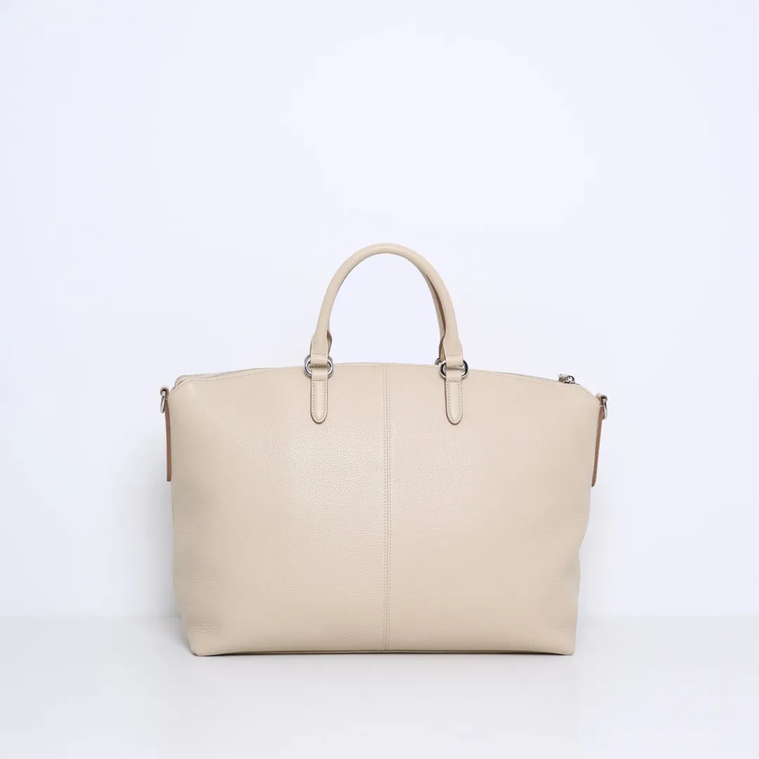 De rechthoekige basis biedt voldoende ruimte voor al je essentiële spullen zoals een laptop, documenten en persoonlijke items, terwijl de afgeronde hoeken een subtiele vrouwelijke touch toevoegen. De handtas is voorzien van stevige handvatten, perfect voor een professionele uitstraling wanneer je onderweg bent naar kantoor of een zakelijke bijeenkomst.