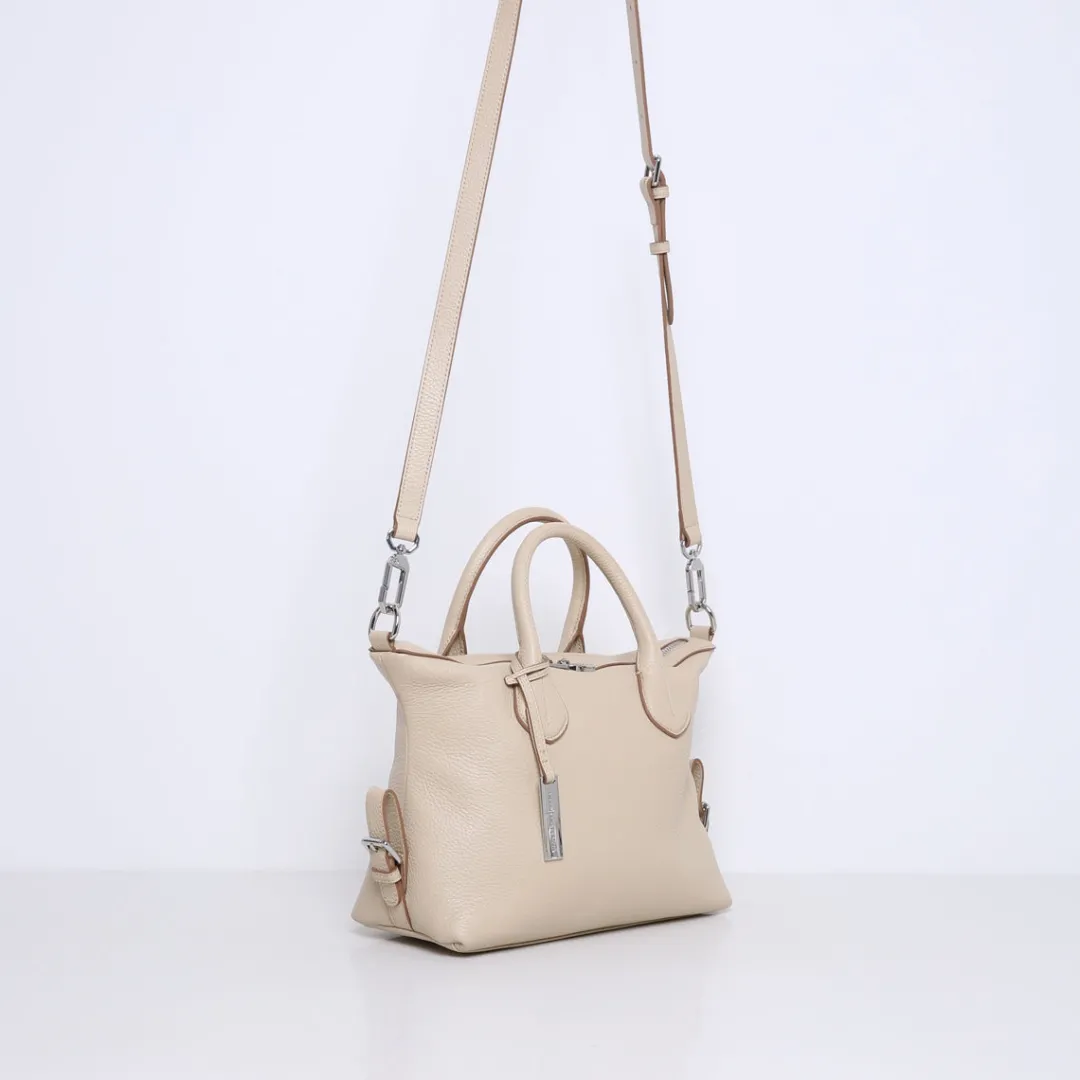De tas is gemaakt van zacht en soepel rundleer. Beschikt over meerdere binnenvakjes en is gevoerd met suedine (viscose) materiaal. Met de afneembare, verstelbare leren schouderband kun je deze handtas ook als crossbody tas dragen.