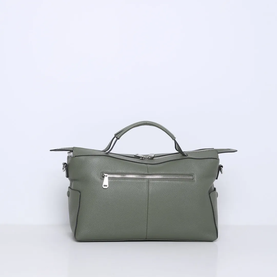 De tas is gemaakt van zacht soepel rundleer en is gesloten aan de bovenkant met rits.