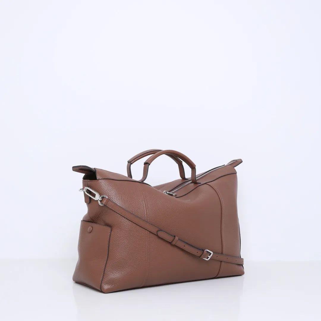 De tas is gemaakt van zacht soepel rundleer en is gesloten aan de bovenkant met rits.